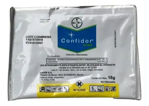 CONFIDOR 18 g CategoríasFertilizante Macetas Tierras PLANTAS Césped Semillas Agroquímicos Herramientas Insumos Varios CONFIDOR 18 g$11.000 es un insecticida sistémico que se utiliza para controlar plagas chupadoras en diversos cultivos CONFIDOR 18 g cantidad Comprar ahora Categoría: Agroquímicos Información adicional Información adicional Peso 0,018 kg Dimensiones 10,00 × 14,00 cm Productos relacionados Hormix en Polvo $4.000 Añadir al carrito AgotadoMyrmec 200gr $4.200 Leer más Babotox 250GR $7.500 Añadir al carrito Hortal Mix Granulado $2.800 Añadir al carrito